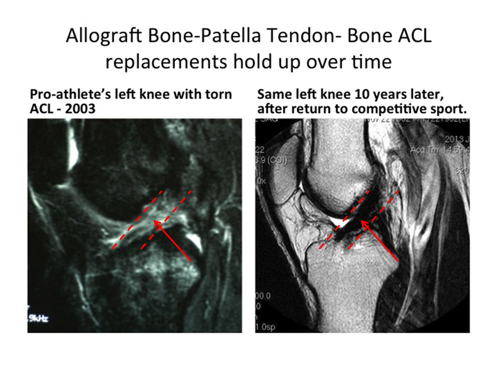 The ACL is the key guiding ligament of the knee joint. Unfortunately, an ACL rupture is an all too common injury in sports. Treatment options vary. Some surgeons use the patient’s own tissue from their patellar tendon or hamstrings, some use donor tissue from a tissue bank. It's a controversial choice. Robbing Peter to pay Paul is clearly not the future of any treatment; moving a patient’s own tissue from one place to another weakens the knee and permanently increases the risk of arthritis. On the other hand, studies have shown that donor tissue from a bank produces mixed results. Thus many surgeons continue to take tissue from the patient in all cases or refuse to use allografts in young or athletic patients.